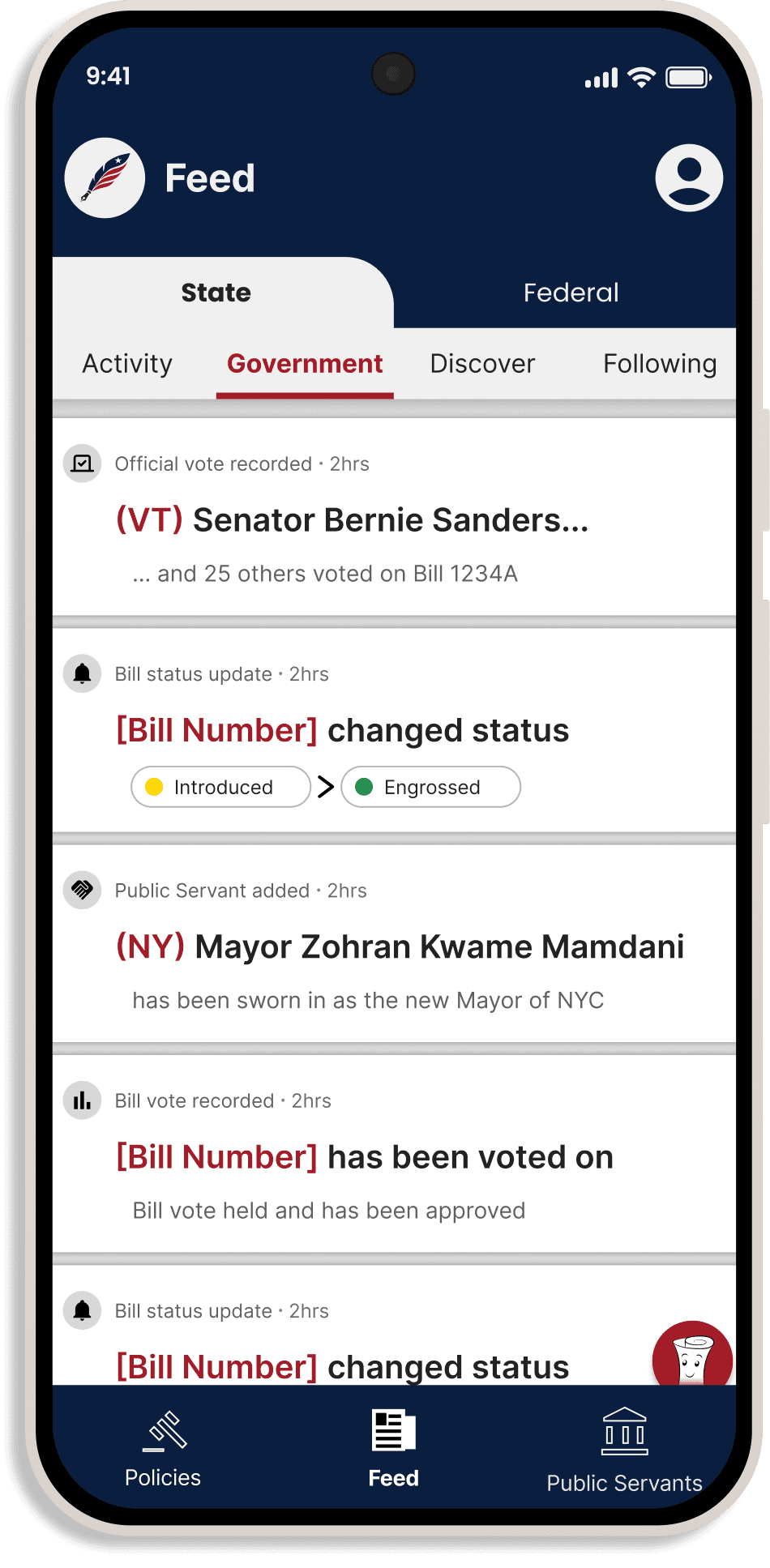 Feed cards denote the type of activity or update - whether it’s a status change to a bill, a legislator’s recorded vote, or a user’s comment on a bill.